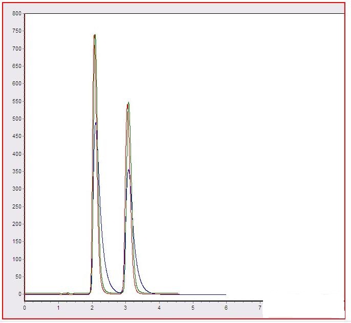 先看一下污染后的色譜圖(黑色)再生后的色譜圖(綠色) 修補后的色譜圖(紅色):