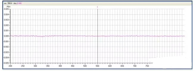 一般儀器說明書上給出的基線噪聲指標是狹義的概念,具體方法就是在某一個波長下(一般是500nm),做一個時間掃描,看看所測得的噪聲的最大峰-峰值的范圍是多大。例如圖-6所示: