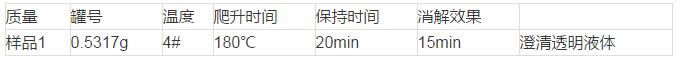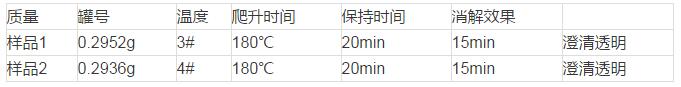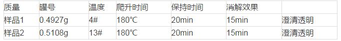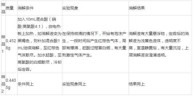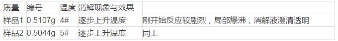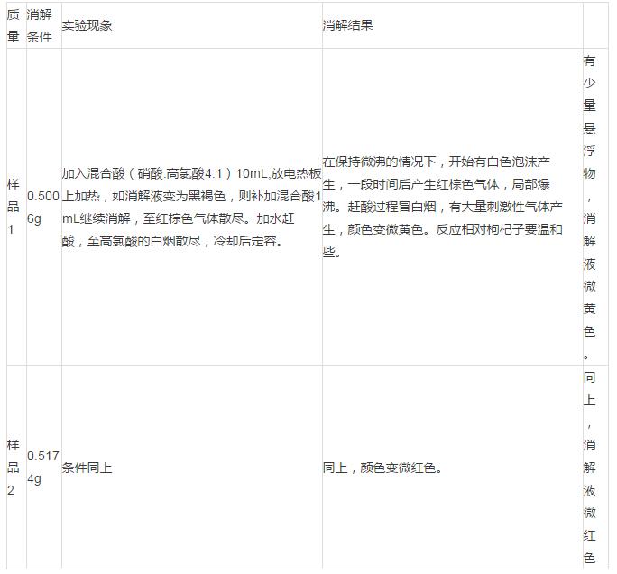 1.濕法消解,加入混合酸10mL進行消解,消解過程比較耗時,產生大量紅棕色氣體,爆沸較嚴重,難于控制;消解液有少量懸浮物,消解效果還不錯。