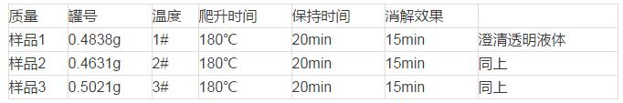 對兩個大米樣品(種類與批號一樣)的消解條件,由消解結果可以看出,大米在180℃溫度下僅用硝酸作為消解液,就可以得到很好的消解結果。