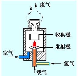 FID的電離室由金屬圓筒作外罩,底座中心有噴嘴;噴嘴附近有環狀金屬圈(極化極,又稱發射極),上端有一個金屬圓簡(收集極)。兩者間加90~300V的直流電壓,形成電離電場加速電離的離子。收集極捕集的離子硫經放大器的高組產生信號、放大后物送至數據采集系統;燃燒氣、輔助氣和色譜柱由底座引入;燃燒氣及水蒸氣由外罩上方小孔逸出。