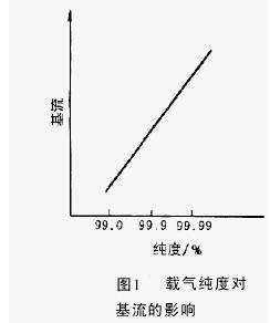 載氣純度直接影響ECD的基流或基頻。圖1為載氣純度對(duì)基流的影響。為保證ECD池的潔凈,降低雜質(zhì)俘獲池中的自由電子,一般要求載氣純度在99.99%以上,還要外加凈化器,以除去殘留的氧和水。氧具有強(qiáng)烈的吸電子性,使基流下降。