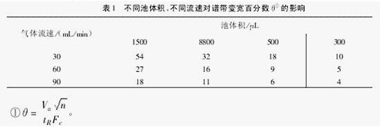 (1)為保持毛細(xì)管柱達(dá)一定的柱效,需加尾吹氣,以減小譜帶柱后變寬。表1為n=3000m-1,tR=5min時(shí),不同檢測(cè)器體積和不同氣體流速時(shí),譜帶變寬的百分?jǐn)?shù)(θ)。可以看出:同一色基流的影響譜柱,其后接的ECD池體積越大,為達(dá)相同柱效所需尾吹氣流速越大。