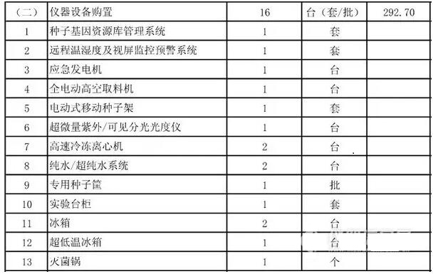項目建設地點位于海南省儋州市寶島新村,主要建設內容為新建中期種子備份庫1224平方米,道路與場地硬化950平方米,以及照明、給排水、消防等配套室內外工程;購置儀器設備16臺(套/批)。總投資966萬元,全部為中央預算內投資。項目建設期為2年。