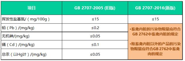 2、GB2707-2016中依舊保留了揮發(fā)性鹽基氮的限量指標(biāo),檢測(cè)方法為GB5009.228。而污染物限量、農(nóng)藥殘留限量和獸藥殘留限量分別參照國(guó)家標(biāo)準(zhǔn)。