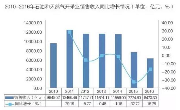 2016年,我國石油和天然氣開采業(yè)行業(yè)資產(chǎn)總額為20036.3億元,同比下降3.09%;實(shí)現(xiàn)銷售收入6470.3億元,同比下降16.78%;利潤總額同比下降159.18%。
