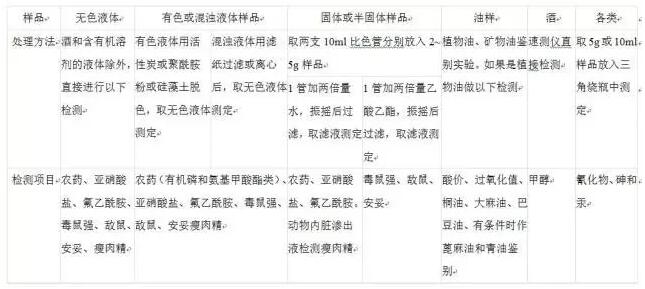 常見的中毒物質主要有農藥(有機磷和氨基甲酸酯類)、鼠藥(毒鼠強、氟乙酰胺、敵鼠、安妥)、亞硝酸鹽、甲醇、砷和汞、氰化物、非食用油和酸敗油脂等等。現場操作時,可視不同的物質采取不同的處理方法測定一個系列的項目。這樣可以免去許多樣品前處理的重復操作,降低工作量,提高工作效率。步驟如下: