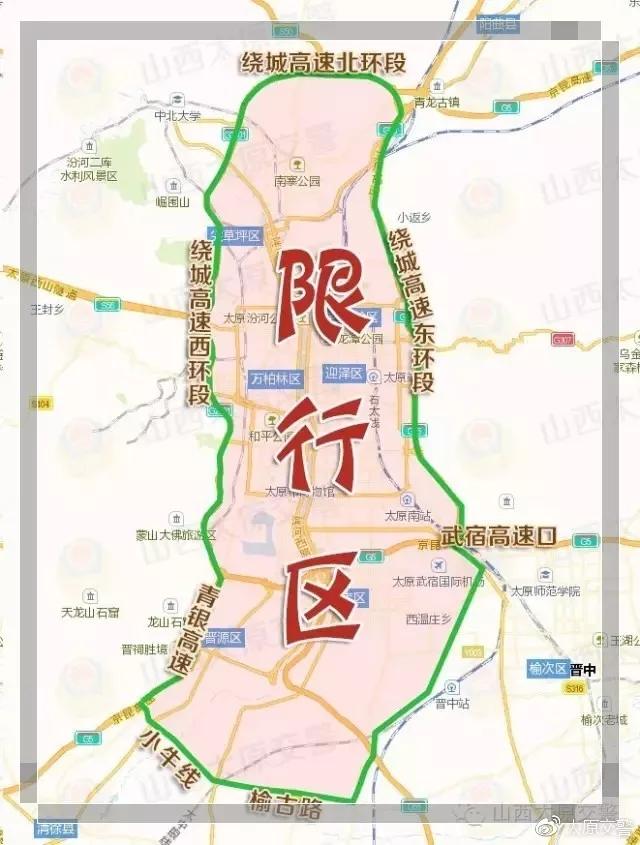 二、限行區(qū)域:繞城高速東環(huán)段、太榆路(武宿高速口至晉中段)以西,繞城高速北環(huán)段以南,繞城高速西環(huán)段、青銀高速(太原羅城至清徐段)以東,小牛線、榆古路以北(不含上述道路)道路范圍內(nèi)。